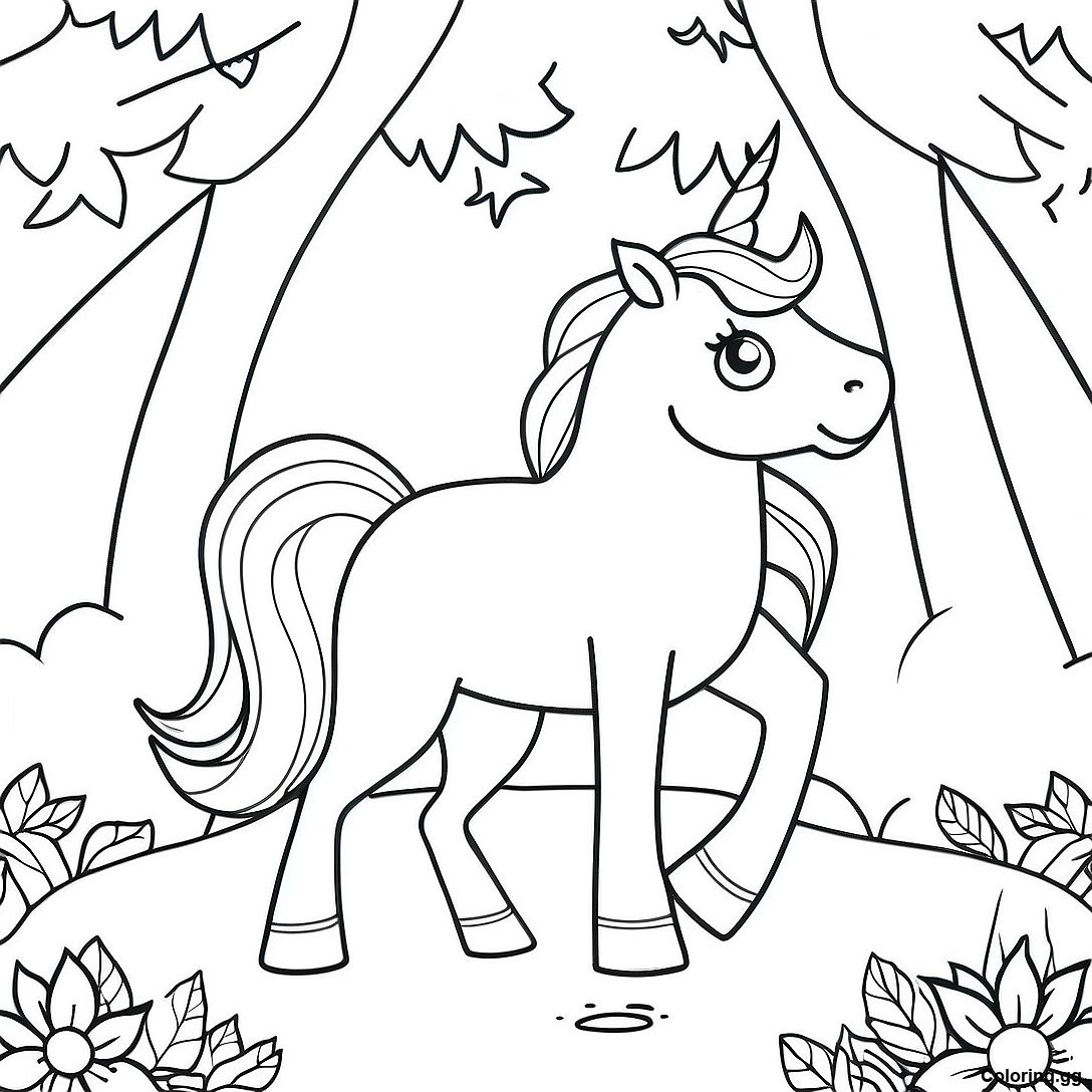 جادوئی جنگل میں شاندار یونی ہورن رنگ بھرنے والا صفحہ